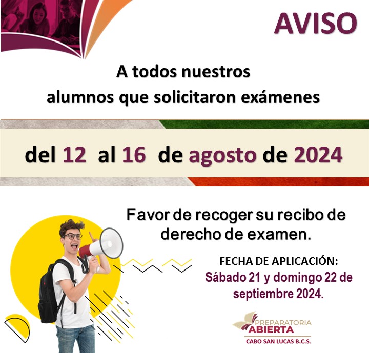 De igual manera, dio a conocer que los exámenes que se solicitaron del 12 al 16 de agosto del 2024, se aplicarán el sábado 21 y domingo 22 de septiembre 2024, en las oficinas de la Preparatoria Abierta, de 09:00 de la mañana a 07:00 de la tarde.