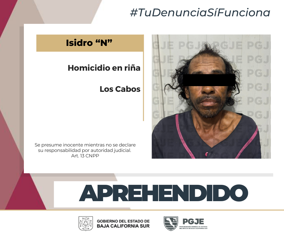 Por su probable responsabilidad en la comisión del delito de homicidio en riña, la Procuraduría General de Justicia del Estado (PGJE) de Baja California Sur aseguró a un hombre, en operativo realizado en Cabo San Lucas.