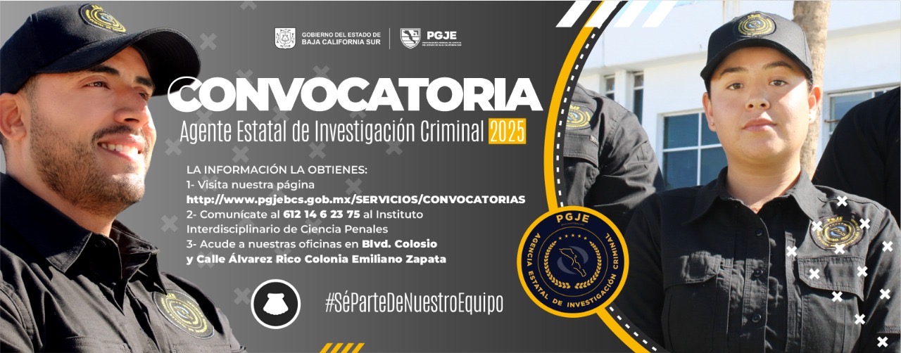 La Procuraduría General de Justicia del Estado (PGJE) de Baja California Sur invita a hombres y mujeres con vocación de servicio a unirse a la institución como Agentes del Ministerio Público o Agentes de Investigación Criminal.