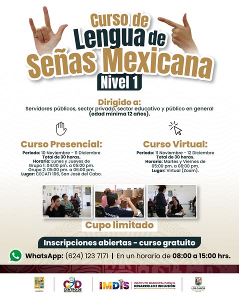 Los Cabos, Baja California Sur.- Con el propósito de fortalecer la inclusión y mejorar la comunicación con personas con discapacidad auditiva en el municipio, el Instituto Municipal para el Desarrollo e Inclusión de Personas con Discapacidad (IMDIS) abrió las inscripciones para los cursos gratuitos de Lengua de Señas Mexicana (LSM), niveles 1 y 4, dirigidos a servidoras y servidores públicos, personal del sector privado, integrantes de la comunidad educativa y ciudadanía en general.