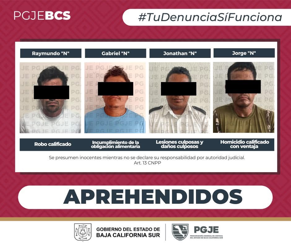 La Procuraduría General de Justicia del Estado (PGJE) de Baja California Sur, a través de la Unidad de Mandamientos Judiciales, cumplimentó diversas órdenes de aprehensión en distintos municipios de Baja California Sur, en coordinación con autoridades estatales y de otras entidades federativas.