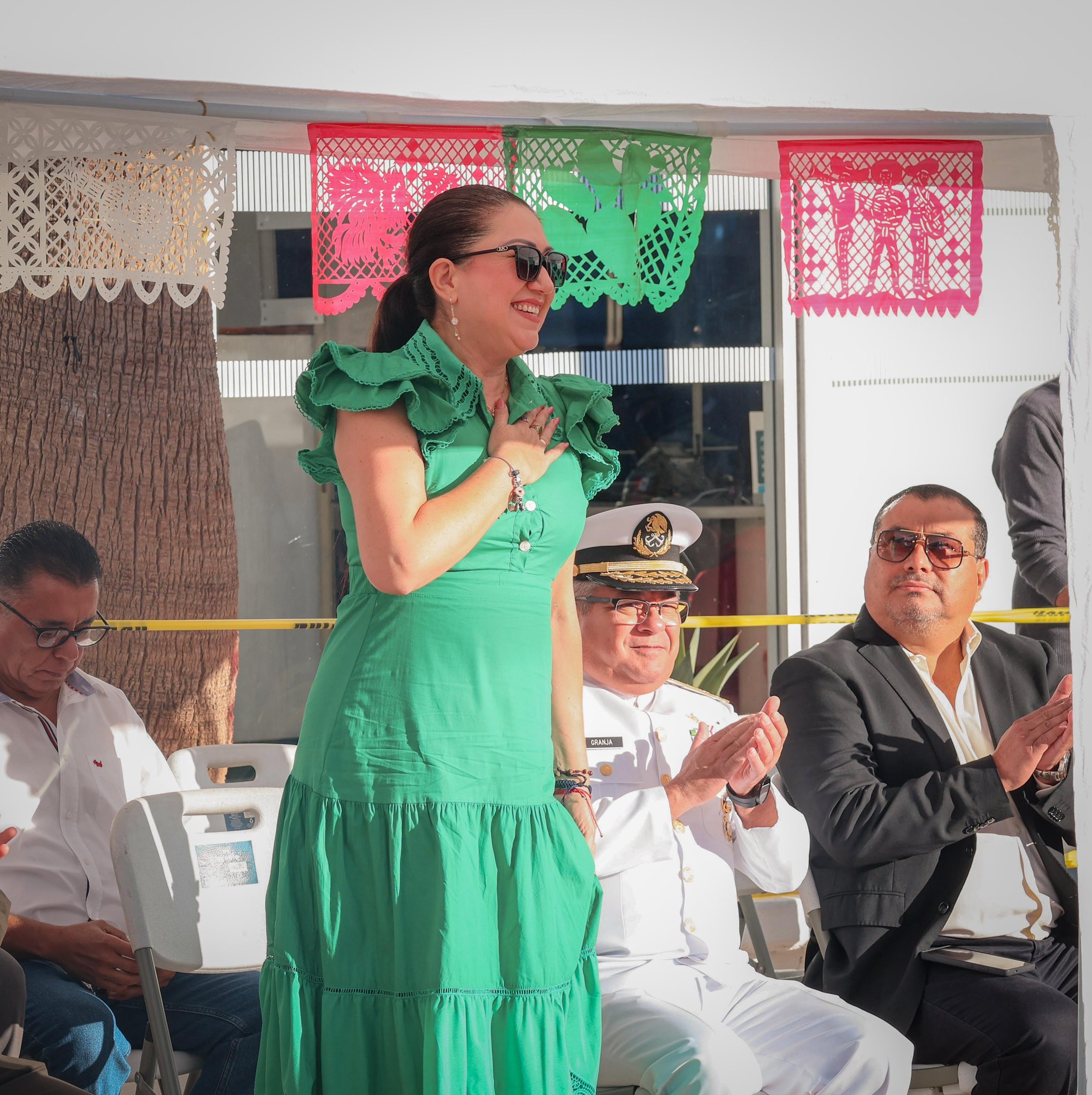 La presidenta municipal, acompañada por la secretaria general del Ayuntamiento, Celina Ramírez; la presidenta honoraria del Sistema DIF Mulegé, GyselleEdith Hernández Aguilar; el síndico municipal, Luis Sández; la regidora Yessica López; representantes del sector educativo; así como por representantes de las Fuerzas Armadas, encabezó la ceremonia y el arranque del desfile, dando paso al recorrido de los contingentes que participaron en esta conmemoración histórica.