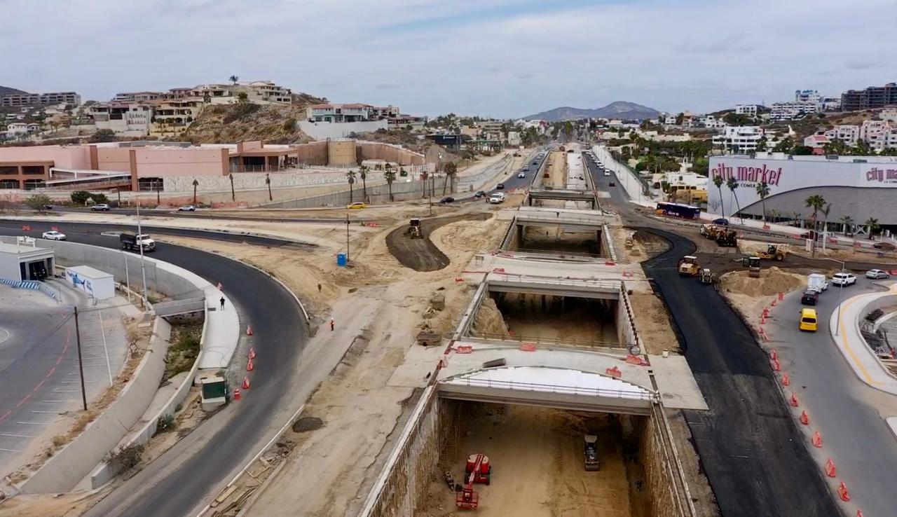Actualmente, los trabajos se concentran en la construcción del paso deprimido, que contará con cuatro carriles, dos en sentido Cabo San Lucas-San José del Cabo y dos en sentido contrario, además de vialidades laterales, puentes de retorno y accesos que mejorarán la conexión hacia la zona hotelera y el aeropuerto.