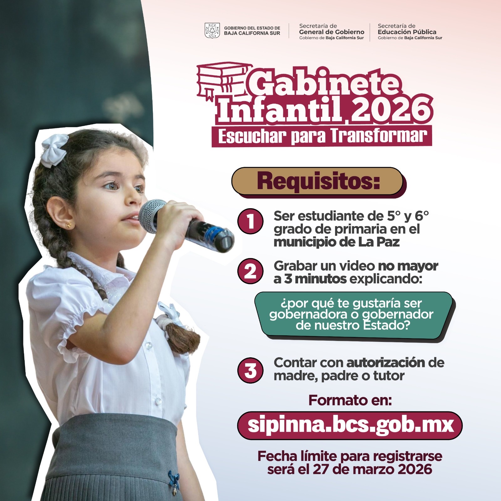 Para su registro, deberán enviar un video de hasta tres minutos en el que expresen por qué desean ser gobernadora o gobernador; adjuntar la autorización firmada por madre, padre o tutor, disponible en sipinna.bcs.gob.mx; así como un documento que acredite su grado escolar.