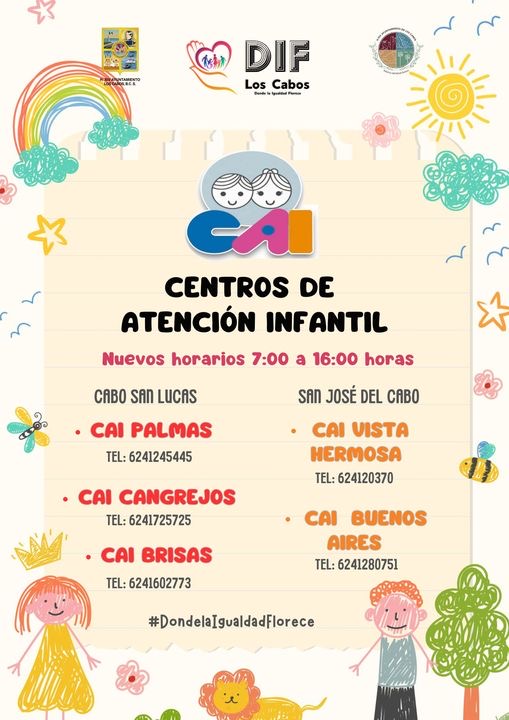 Indicó que actualmente son cinco los CAI que opera el SMDIF, en Cabo San Lucas en las colonias Las Palmas, Los Cangrejos y Brisas del Pacífico, mientras que en San José del Cabo se encuentran en las colonias Vista Hermosa y Buenos Aires, con nuevo horario de atención de 08:00 de la mañana a 4:00 de la tarde.