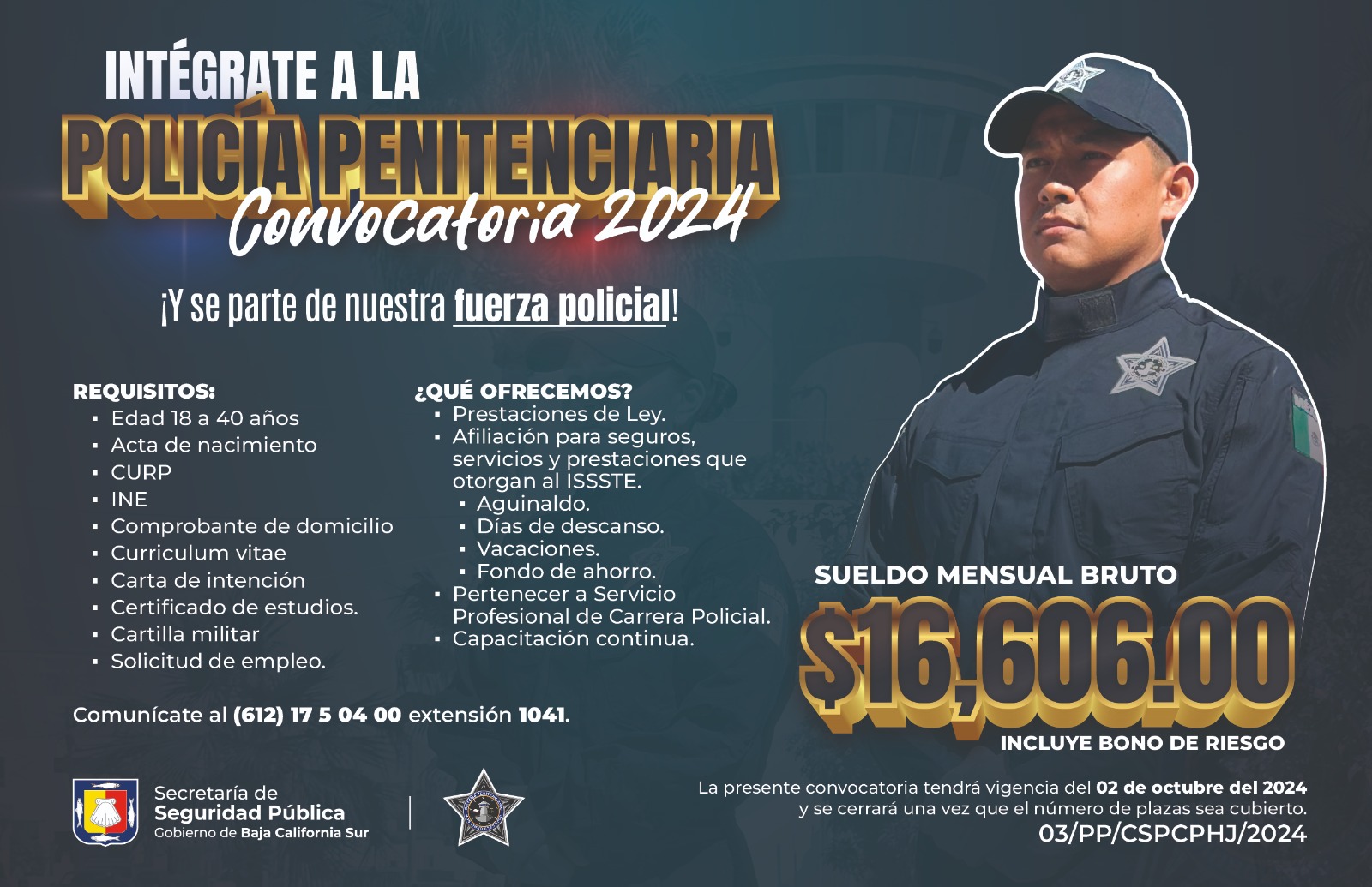 La Secretaría de Seguridad Pública del Estado (SSPE), a través del Departamento de Reclutamiento, anuncia la apertura de la Convocatoria 2024 para el perfil de Policía Penitenciario, por lo que hace un llamado a las personas interesadas a participar en el proceso de selección y reclutamiento.