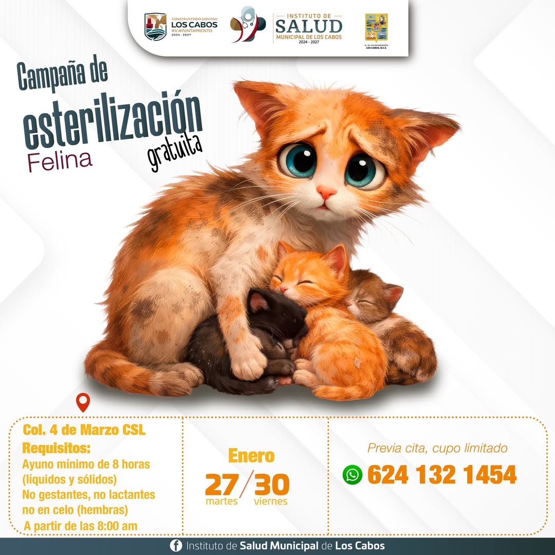 Los Cabos, Baja California Sur.– Con el objetivo de promover el bienestar animal, prevenir la sobrepoblación felina y fortalecer la salud pública, el Instituto de Salud Municipal de Los Cabos invita a la ciudadanía a participar en la Campaña de Esterilización Felina que se llevará a cabo este martes 27 y viernes 30 de enero en la colonia 4 de Marzo, en Cabo San Lucas.