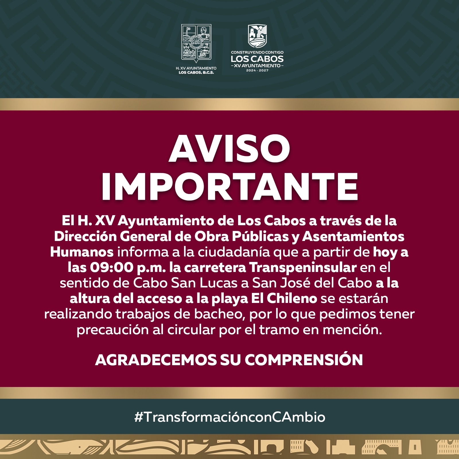 Los Cabos, Baja California Sur.- Por instrucciones del presidente municipal Christian Agúndez Gómez, se informa a la ciudadanía que este lunes 17 de noviembre a partir de las 21:00 horas se pondrán en marcha labores de bacheo y reencarpetado en uno de los tramos con mayor afectación vial en la zona de Chileno, como parte del programa permanente “Caza Baches”, cuyo objetivo es garantizar vialidades seguras y en óptimas condiciones para todas y todos.