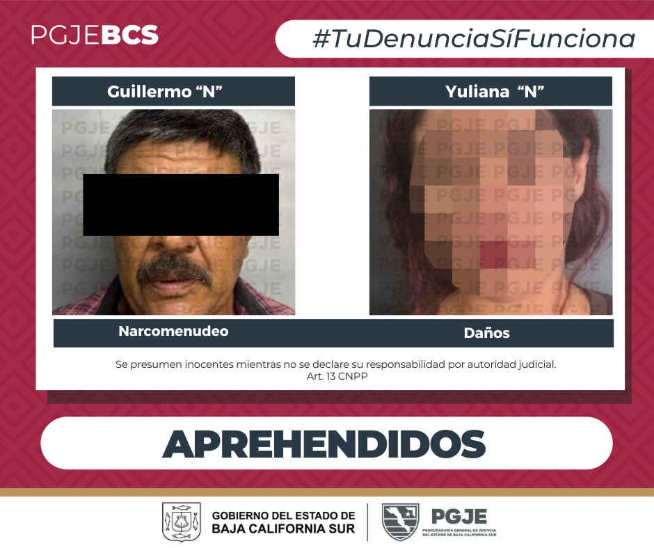 En seguimiento a investigaciones en torno a denuncias por diversos hechos ilícitos, agentes de investigación de laProcuraduría General de Justicia del Estado (PGJE), realizaron operativos, mediante los cuales se aprehendió a 2 personas, una mujer y un hombre en los municipios de La Paz y Los Cabos.