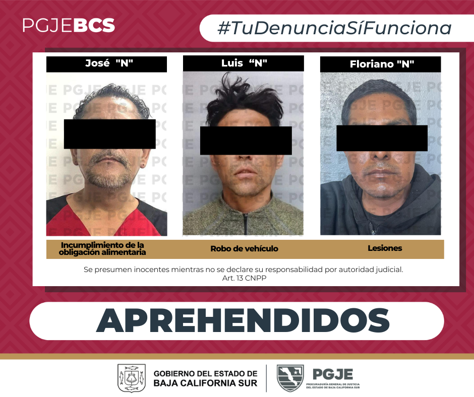 En seguimiento a investigaciones en torno a denuncias por diversos hechos ilícitos, agentes de investigación de la Procuraduría General de Justicia del Estado (PGJE), realizaron operativos, mediante los cuales se aprehendió a 3 personas del sexo masculino en La Paz y Los Cabos.