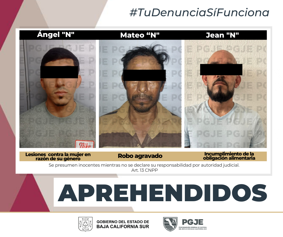 En seguimiento a investigaciones en torno a denuncias por diversos hechos ilícitos,agentes de investigación de la Procuraduría General de Justicia del Estado (PGJE), realizaron operativos, mediante los cuales se aprehendió a 3 personas del sexo masculino en La Paz y Los Cabos.