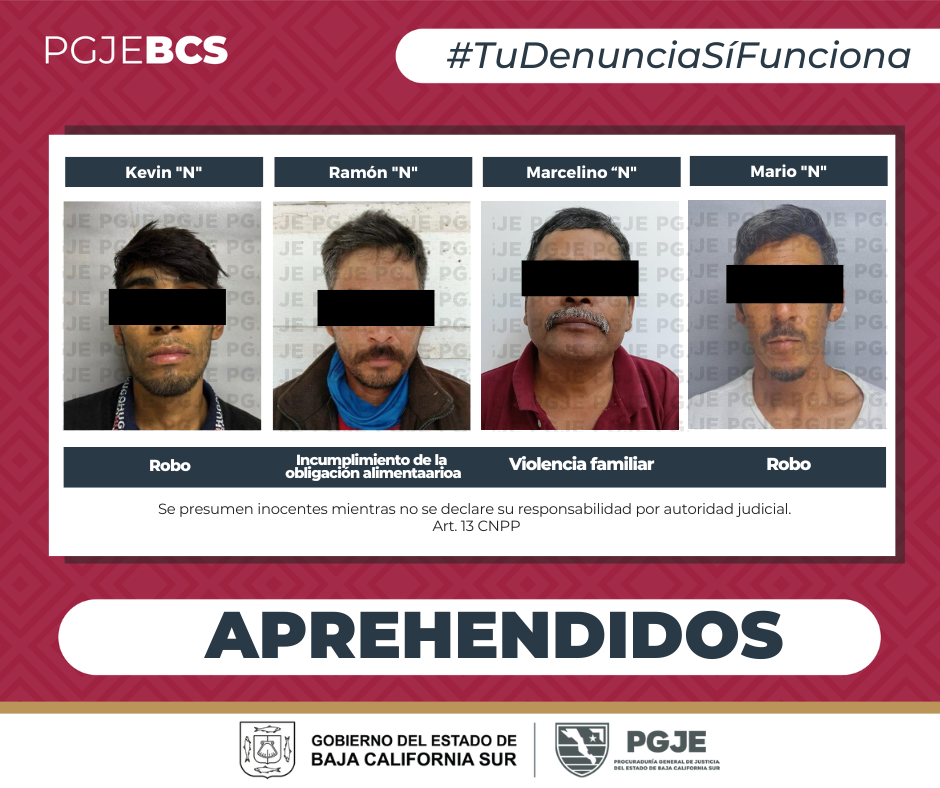 La Procuraduría General de Justicia del Estado (PGJE), realizó operativos mediante los cuales, aprehendió a 4personas del sexo masculino, en seguimiento a investigaciones por denuncias de actividades ilícitas en los municipios de La Paz y Mulegé.