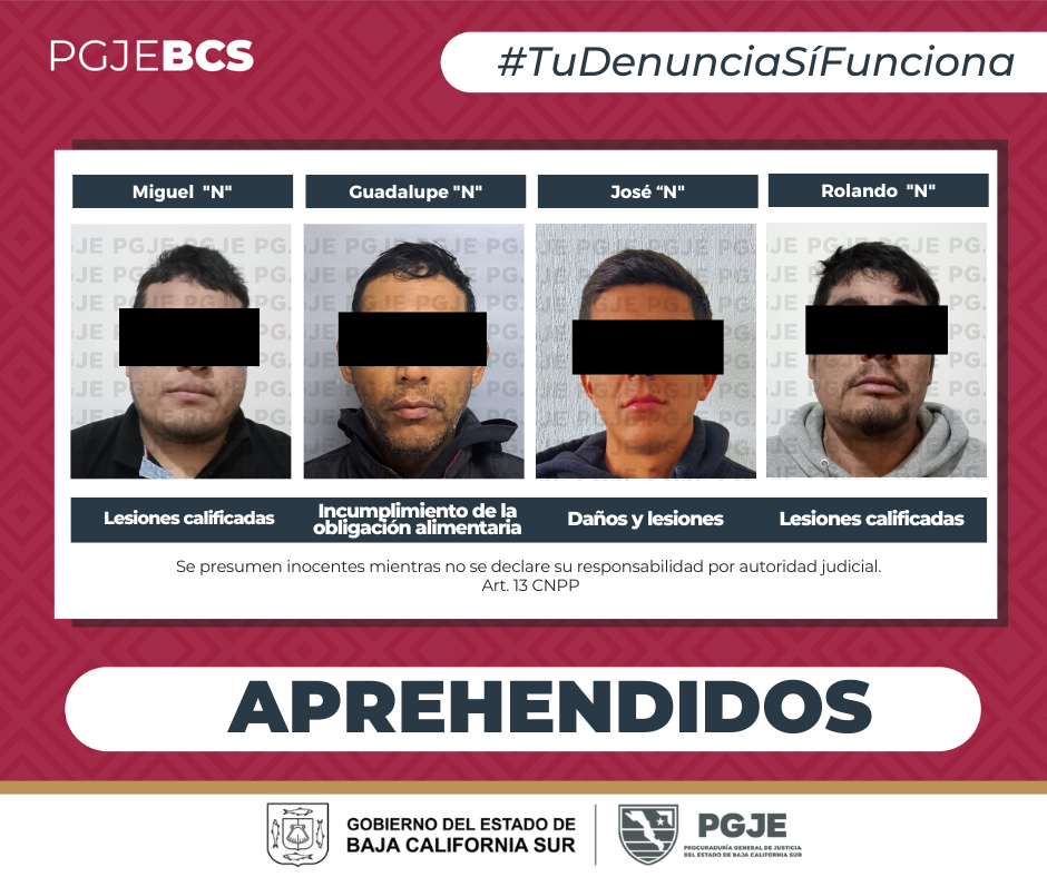 Agentes de investigación de la Procuraduría General de Justicia del Estado (PGJE), realizaron operativos, mediante los cuales cumplimentaron 4 órdenes de aprehensión a personas del sexo masculino por los delitos de incumplimiento de la obligación alimentaria, lesiones y daños, en los municipios de La Paz Los Cabos y Mulegé.
