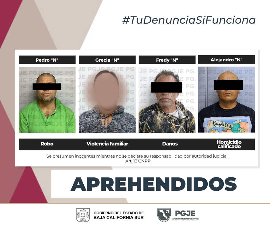 Luego de las primeras investigaciones, derivada de denuncias de delitos interpuestas por víctimas u ofendidos, agentes de investigación de la Procuraduría General de Justicia del Estado (PGJE), realizaron operativos, mediante los cuales se aprehendieron a 3 personas del sexo masculino y una mujer, por robo, daños, violencia familiar y en colaboración con la Procuraduría del estado de Hidalgo, por homicidio calificado.