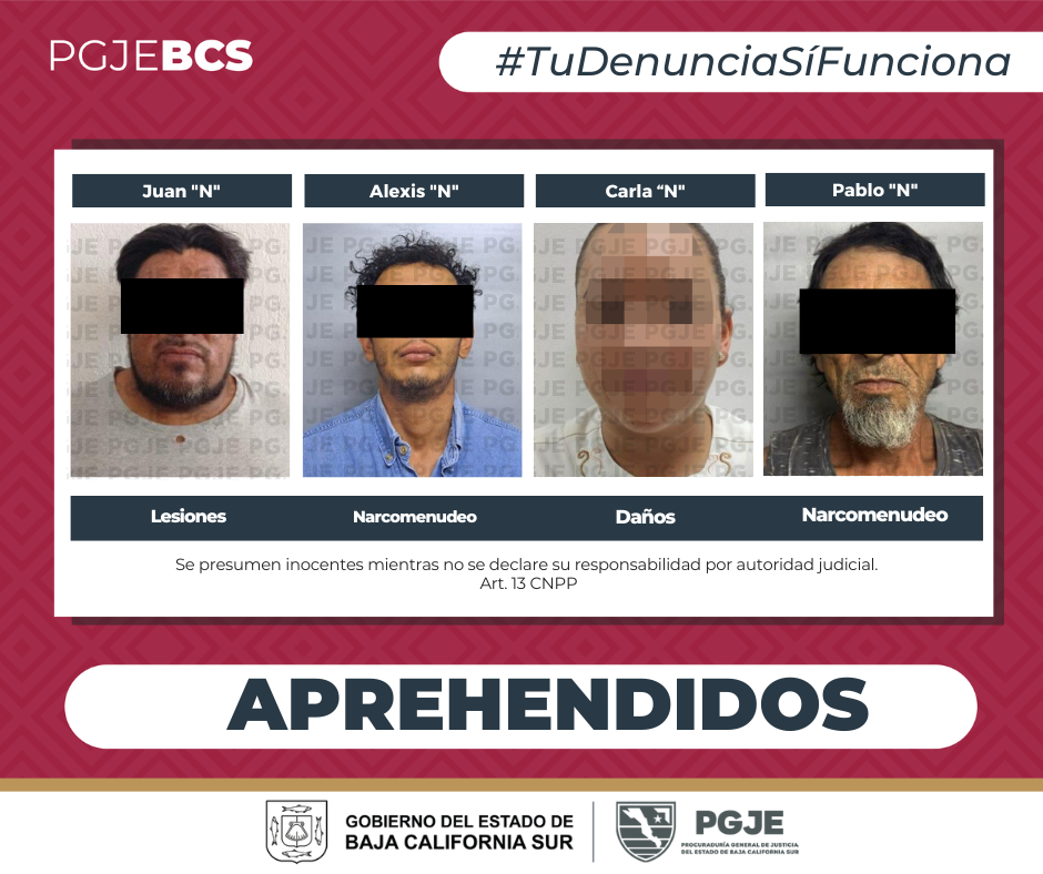 En seguimiento a investigaciones por denuncias de actividades ilícitas, la Procuraduría General de Justicia del Estado (PGJE), realizó operativos mediante los cuales, aprehendió a 4 personas del sexo masculino y una mujer.
