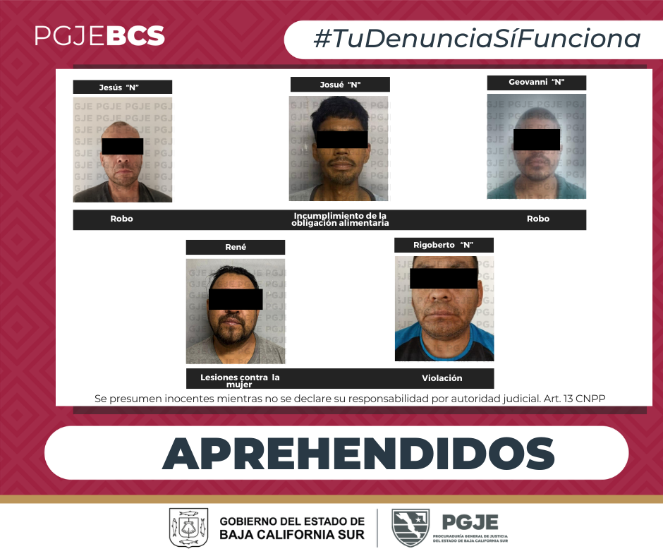 La mañana del sábado 29, por dos cargos del delito de lesiones contra la mujer en razón de su género, René “N”. La quinta orden de aprehensión se cumplimentó en la ciudad de La Paz, en la calle Luis “N”, de la colonia Lagunitas.