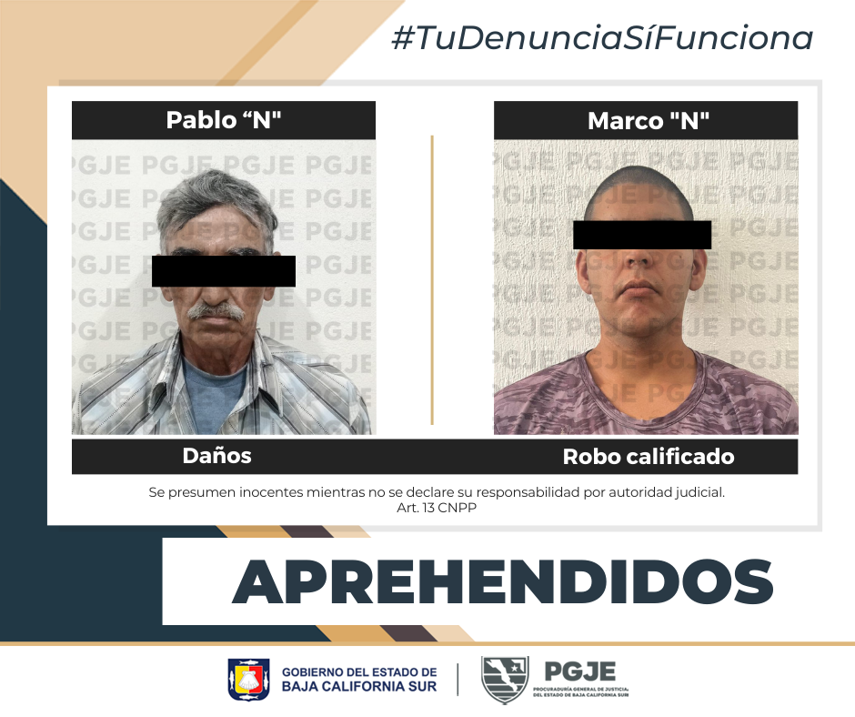 Por los delitos de robo y daños, dos hombres fueron asegurados por elementos de la Procuraduría General de Justicia del Estado (PGJE) de Baja California Sur, en cumplimiento a diversas órdenes de aprehensión.