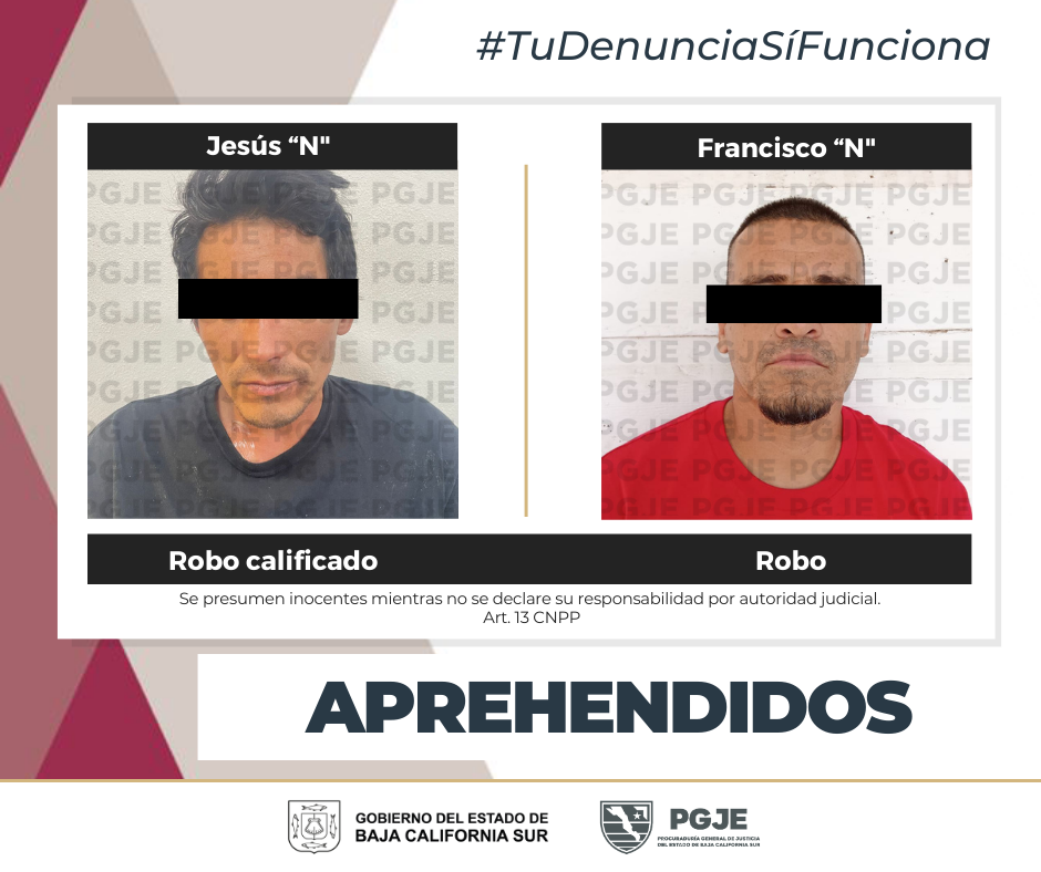 Por su probable responsabilidad en la comisión de diversos hechos delictivos, la Procuraduría General de Justicia del Estado (PGJE) de Baja California Sur aseguró a doshombres, en distintos operativos realizados en Mulegé y La Paz.