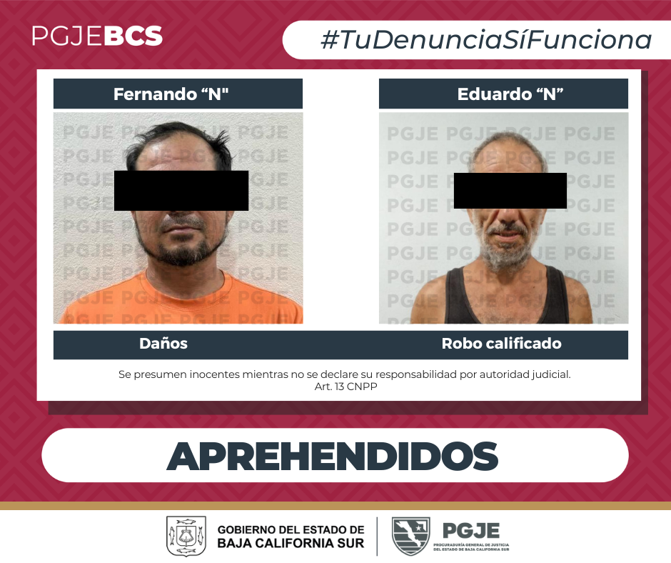 La Procuraduría General de Justicia del Estado (PGJE) de Baja California Sur informa que agentes de investigación de la Unidad de Mandamientos Judiciales cumplimentaron dos órdenes de aprehensión en contra de hombres buscados por distintos delitos.