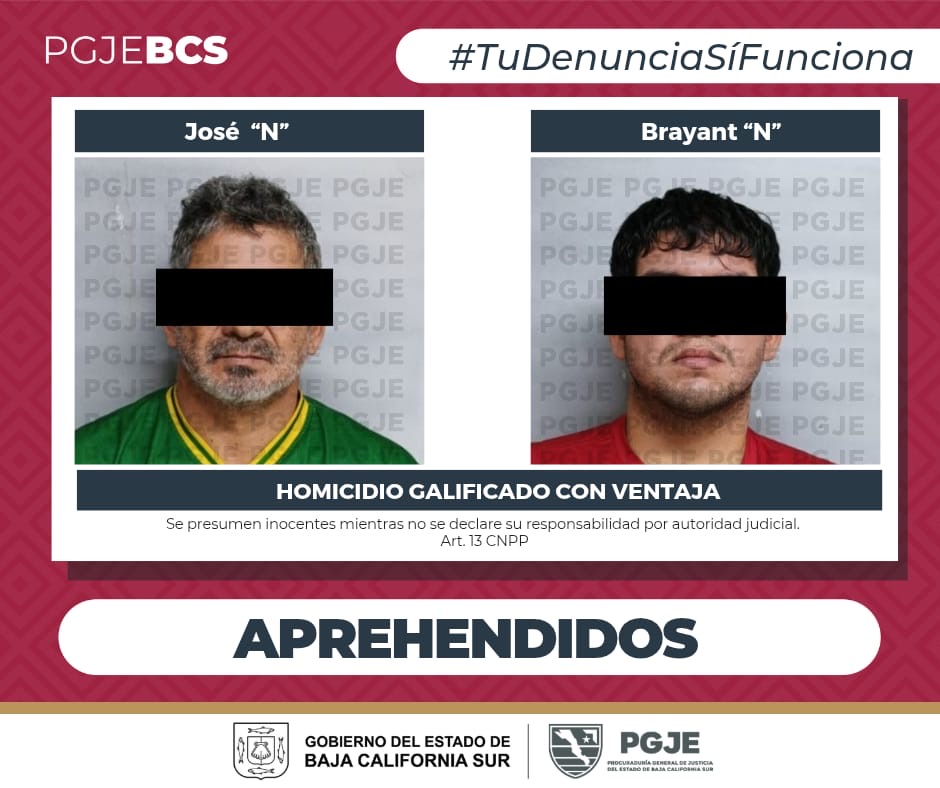 La Procuraduría General de Justicia del Estado (PGJE), por medio elementos de la Unidad de Mandamientos Judiciales en La Paz y de la Unidad de Investigación de Delito de Homicidio Calificado, cumplimentó dos órdenes de aprehensión a doshombres identificados como Brayant “N”, de 29 años de edad, y a José Manuel “N”, de 47 años, por su probable responsabilidad en el delito de homicidio calificado con ventaja, en agravio de quien en vida fuera identificado como Saúl “N”.