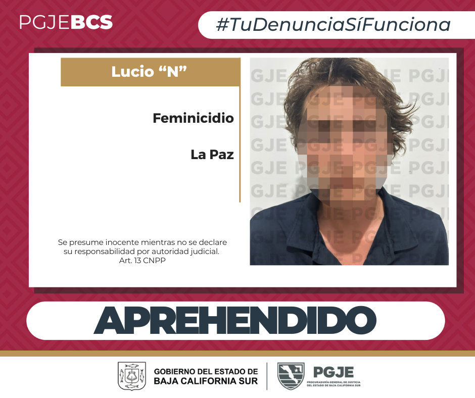 La aprehensión de Lucio N, de 23 años de edad, la realizaron agentes Estatales de Investigación Criminal, la tarde del lunes 10 de febrero en la calle Sal SI Puedes y carretera Transpeninsular en la comunidad Cerritos, delegación de Todos Santos, municipio de La Paz.