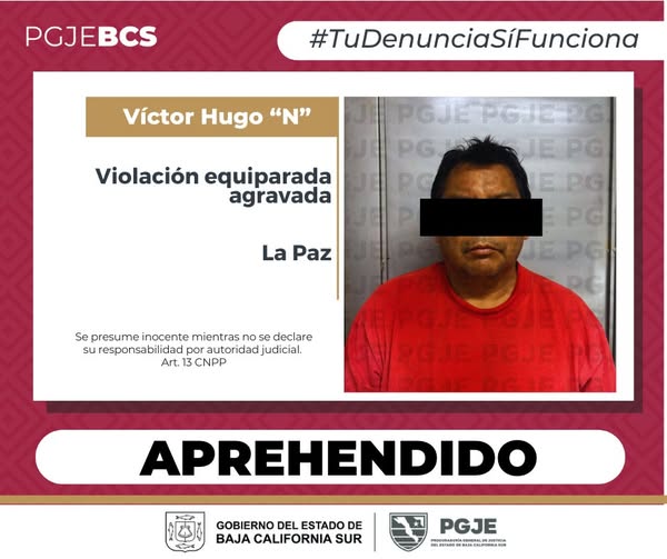 En seguimiento a investigaciones en torno a denuncias por hechos ilícitos, agentes de investigación de la Procuraduría General de Justicia del Estado (PGJE), cumplimentaron orden de aprehensión en contra de una persona del sexo masculino imputado por el delito de violación agravada en La Paz.