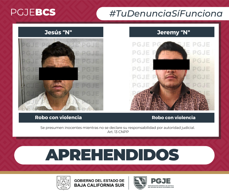 Luego de los trabajos de gabinete y campo la Procuraduría General de Justicia del Estado (PGJE), logró la detención de dos personas del sexo masculino imputados, en diversos hechos, por el delito de robo calificado por haberse cometido en lugar abierto al público con violencia moral por persona armada y robo con violencia moral y física por persona armada.