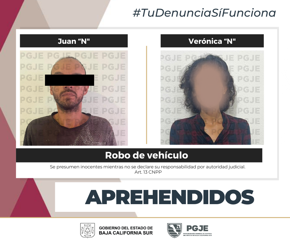 Por el delito de robo de vehículo motor una persona del sexo masculino y una mujer, fueronasegurada por elementos de la Procuraduría General de Justicia del Estado (PGJE) de Baja California Sur, en cumplimiento de las respectivas órdenes de aprehensión en su contra.