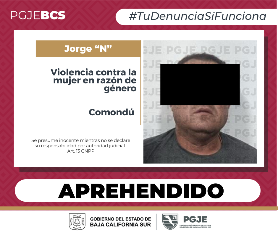 La Procuraduría General de Justicia del Estado (PGJE), por medio de la Unidad de Mandamientos Judiciales, cumplimentó una orden de aprehensión a un hombre de 33 años de edad, originario del estado de Baja California, por su probable responsabilidad en el delito de lesiones contra la mujer en razón de género.