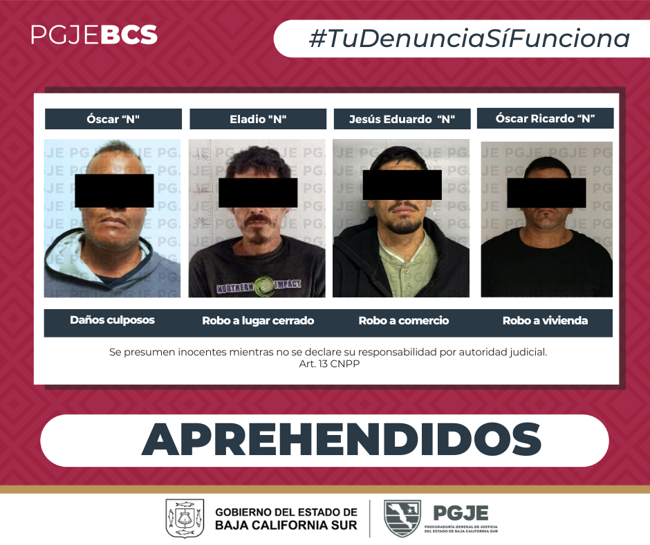Como resultado de labores de investigación y acciones coordinadas, la Procuraduría General de Justicia del Estado (PGJE) de Baja California Sur logró la detención de cuatro personas relacionadas con diversas carpetas de investigación por delitos de robo denunciados en los municipios de Comondú y La Paz.