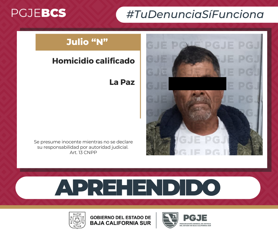 En consecuencia, del trabajo efectuado por Agentes Estatales de Investigación Criminal (AEIC), el imputado fue detenido en el poblado de El Sargento, municipio de La Paz, la tarde del martes 14 de enero del año en curso y será presentado ante el Juez de Control, quien definirá su situación jurídica.