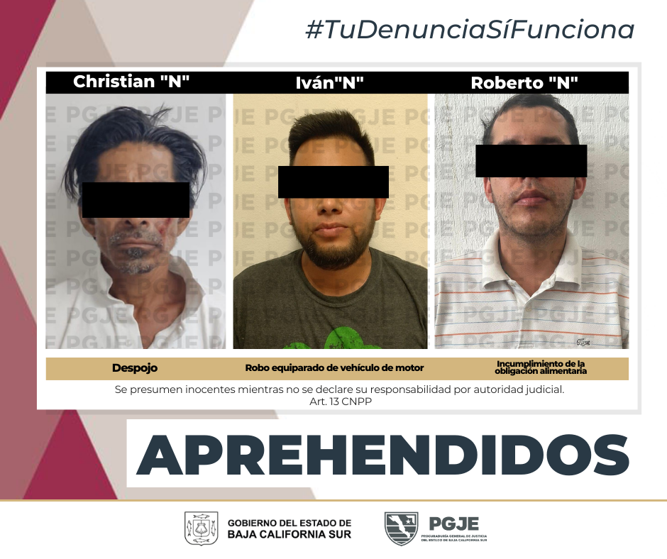 Luego de la denuncia de hechos delictivos, la Procuraduría General de Justicia del Estado (PGJE) inicia las acciones ministeriales para resolverlos, es así que algunos imputados deben ser asegurados, para ser presentados ante la autoridad judicial, como es el caso de las trespersonas del sexo masculino que fueron aprehendidas el sábado 6 y lunes 8 del mes en curso en la Paz y Los Cabos.