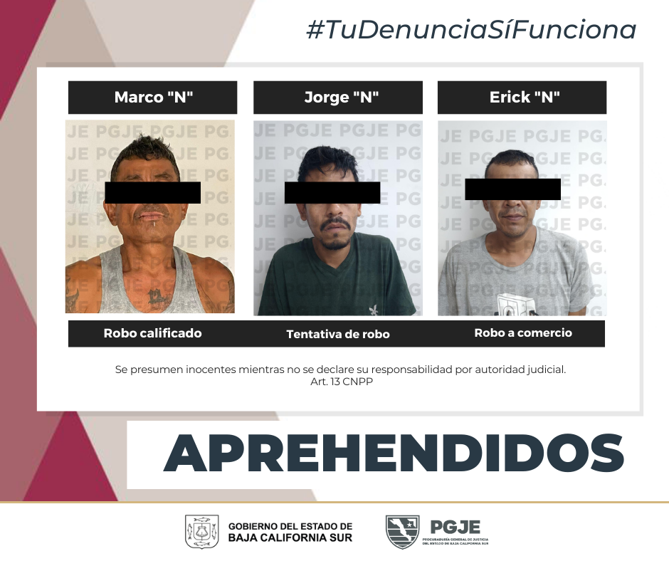 En seguimiento a investigaciones en torno a denuncias por diversos delitos, agentes de investigación de la Procuraduría General de Justicia del Estado (PGJE) de Baja California Sur, realizaron operativos, mediante los cuales se aprehendió a tres personas del sexo masculino.