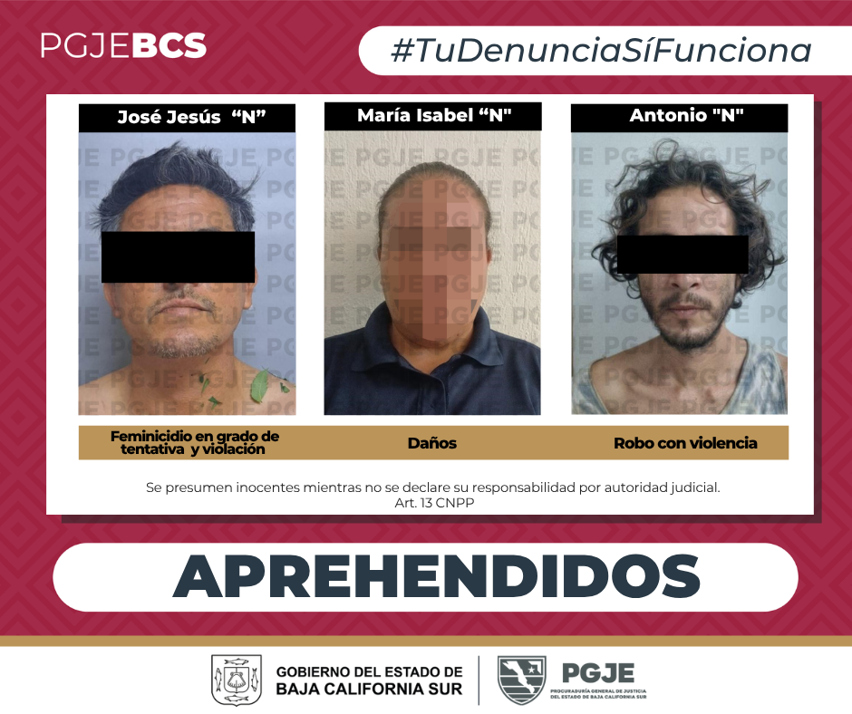 En primera instancia informamos que la tarde del lunes 6 de octubre del año en curso, en la colonia Puesta del Sol, en la ciudad de La Paz, se cumplimentó orden de aprehensión por los delitos de feminicidio en grado de tentativa acabada y violación en contra de José “N”, de 36 años de edad.