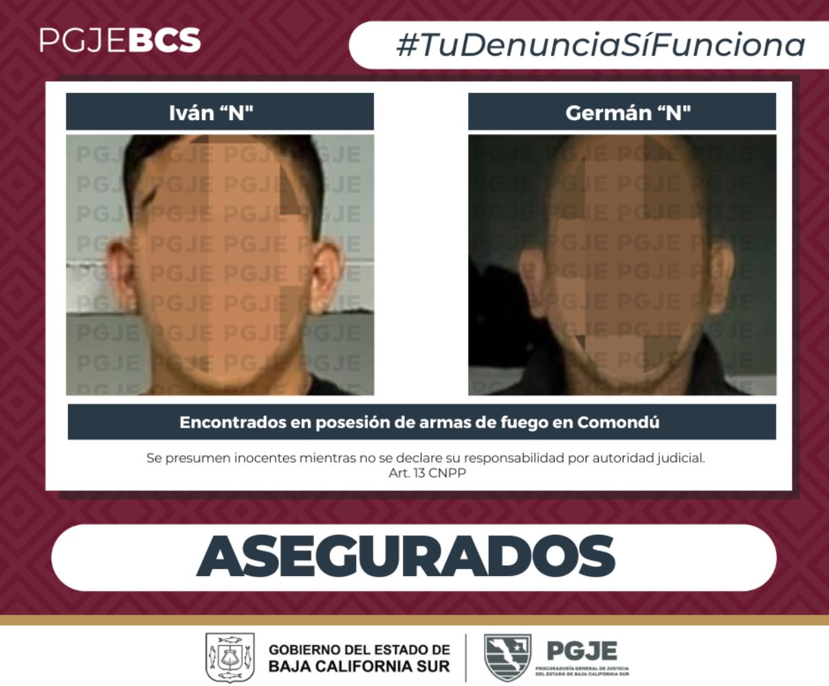 Como resultado de los operativos de la Mesa de Seguridad en Loreto y Comondú, Agentes de Investigación Criminal de la Procuraduría General de Justicia del Estado (PGJE) aseguraron a dos hombres, tres armas largas tipo “cuerno de chivo” con cargadores y cartuchos útiles, dos vehículos y equipo táctico, la tarde del jueves 20 de noviembre, en el tramo carretero Ciudad Constitución–San Carlos.