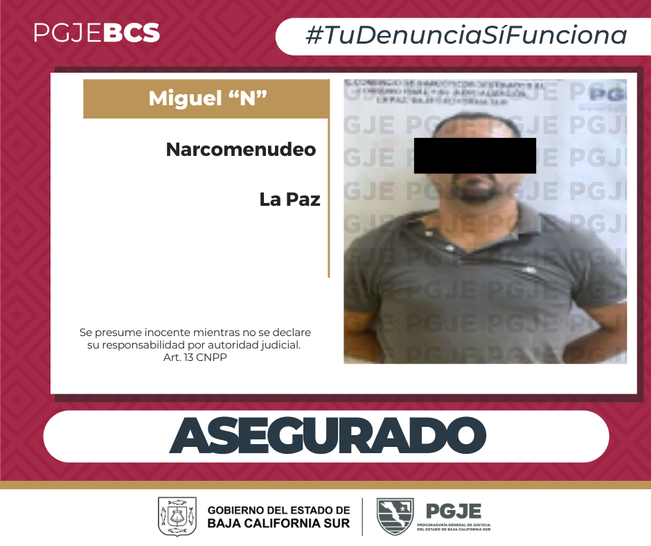 Durante un operativo de investigación, agentes de la Procuraduría General de Justicia del Estado (PGJE) de Baja California Sur, lograron la detención de un hombre, así como el aseguramiento de narcótico, diversos objetos y un vehículo, en hechos ocurridos la tarde del lunes 13 de octubre en la colonia Colina de la Cruz, en La Paz.