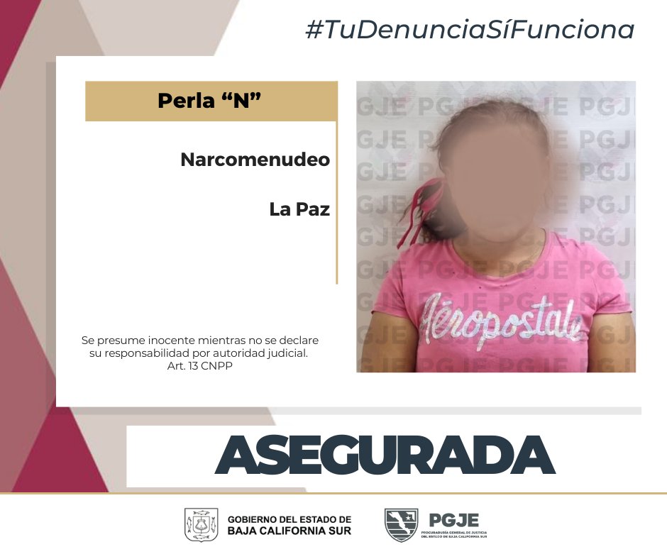 La Procuraduría General de Justicia del Estado (PGJE) de Baja California Sur informa sobre la detención de una mujer de 39 años, quien fue asegurada en posesión de 3 mil dosis de metanfetamina en la capital del estado.
