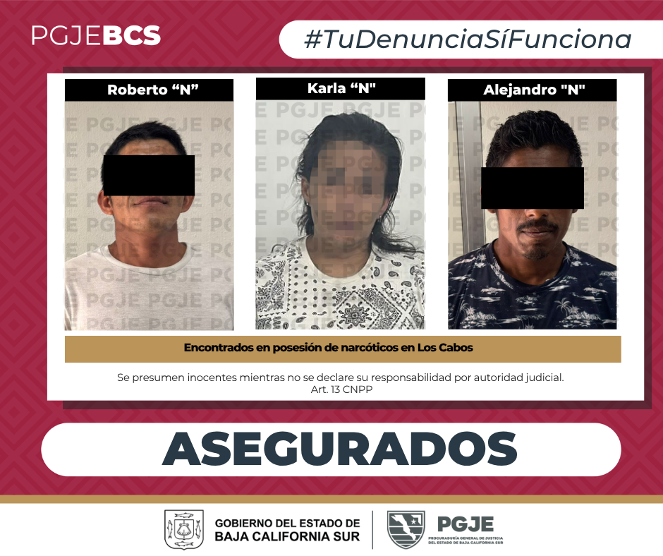 En operativos efectuados el jueves 6 del mes en curso en el municipio de Los Cabos, agentes de investigación de la Subprocuraduría de Atención a Delitos de Alto Impacto (SADAI), de la Procuraduría General de Justicia del Estado (PGJE) de Baja California Sur, lograron la detención de tres personas, una mujer y dos hombres, así como el aseguramiento de narcótico y un vehículo.