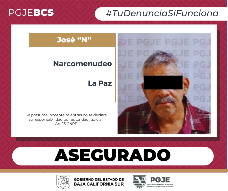 Una persona del sexo masculino y 800 dosis de droga aseguraron la tarde del miércoles 5 de noviembre del año en curso, agentes de investigación de la Subprocuraduría de Atención a Delitos de Alto Impacto, de la Procuraduría General de Justicia del Estado (PGJE) de Baja California Sur, mediante el cumplimiento de una orden de cateo en un domicilio que se ubica en privada de las Avestruces y boulevard Luis Donaldo Colosio en la colonia Las Grullas, en la ciudad de La Paz.