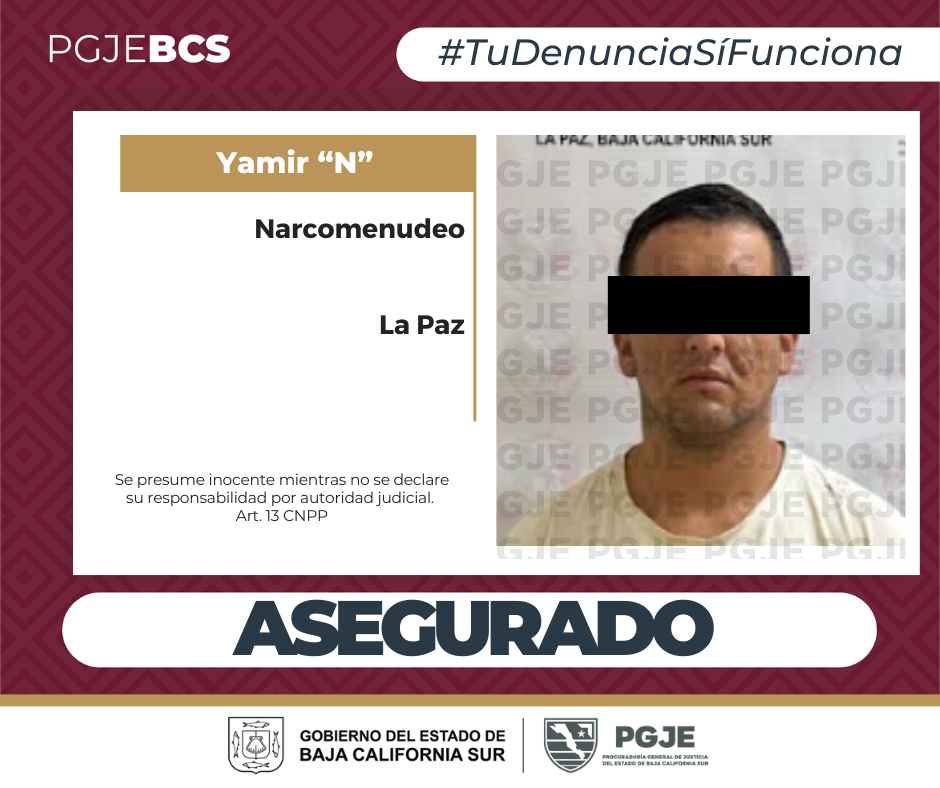 Al realizar operativos para dar seguimiento a las investigaciones para desmantelar redes de distribución de sustancias ilícitas en Baja California Sur, la mañana del miércoles 12 del mes en curso, agentes de investigación de la Procuraduría General de Justicia del Estado (PGJE) lograron la detención de Yamir N, de 25 años, en posesión de droga.