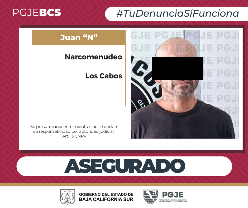 La tarde del miércoles 29 del mes en curso, en la colonia El Zacatal, en San José del Cabo, agentes deInvestigación de Delito de Comercio de Narcóticos de la Procuraduría General de Justicia del Estado (PGJE), de Baja California Sur, aseguraron a una persona del sexo masculino identificado como Juan“N” con 725 dosis de narcóticos.