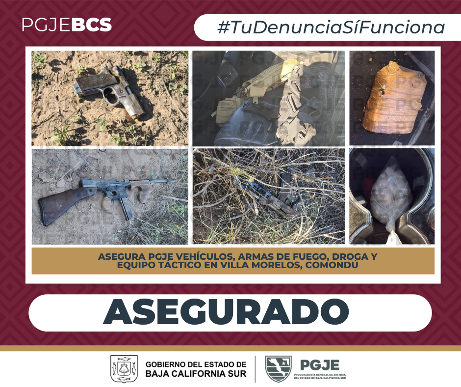Continúan dando resultados las estrategias de inteligencia y combate a la delincuencia de la Procuraduría General de Justicia del Estado (PGJE), a través de la Subprocuraduría de Atención a Delitos de Alto Impacto (SADAI), para combatir el delito de narcomenudeo, con el aseguramiento de 7 mil 200 dosis de droga, 2 armas largas y una corta, equipo táctico y un vehículo, en operativo efectuado la tarde del 3 de marzo del año en curso, en el poblado de Villa Morelos, en el municipio de Comondú.