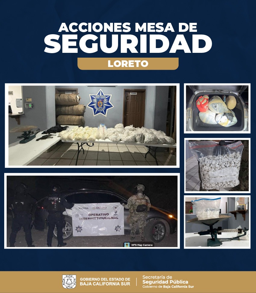 En el marco de los trabajos conjuntos que realiza la Mesa Estatal de Seguridad dentro del Operativo Interinstitucional, la madrugada de este martes en una acción encabezada por el personal de Marina, Policía Estatal Preventiva y Policía Municipal, en coordinación con elementos de Defensa, Guardia Nacional, Fiscalía General de la República, Centro Nacional de Inteligencia y la Procuraduría General de Justicia del Estado, se logró un importante decomiso de narcóticos y armas en el municipio de Loreto.