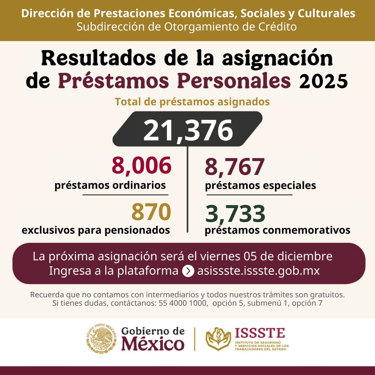 Ciudad de México, a 28 de noviembre de 2025.- El Instituto de Seguridad y Servicios Sociales de los Trabajadores del Estado (ISSSTE), encabezado por el director general Martí Batres Guadarrama, informa que se asignaron 21 mil 376 créditos en el Programa Anual de Préstamos Personales 2025, para todos aquellos que cumplieron los requisitos.