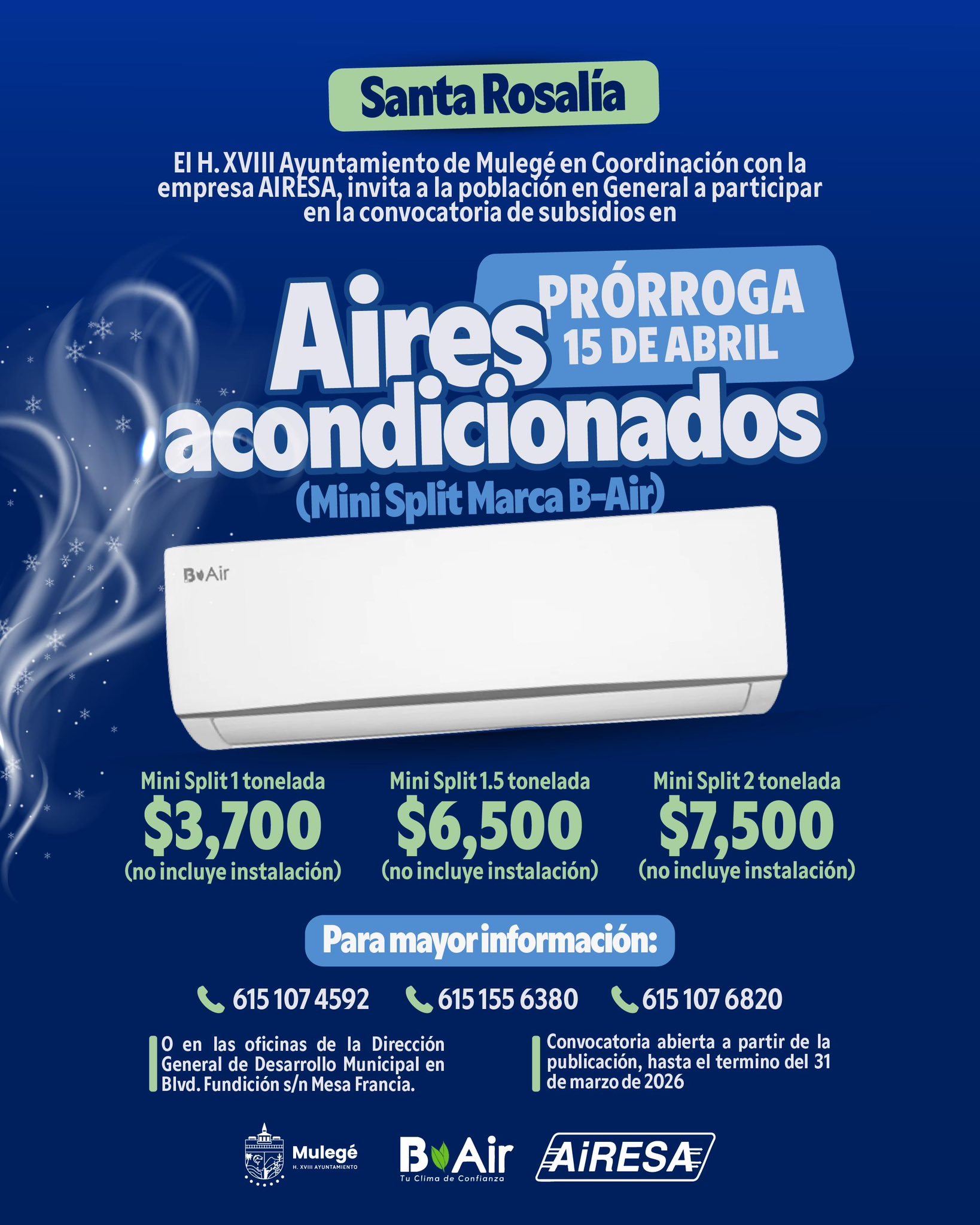 Santa Rosalía, B.C.S.– El H. XVIII Ayuntamiento de Mulegé, en coordinación con la empresa Airesa, informa a la ciudadanía que se extiende la convocatoria del programa de subsidio para la adquisición de aires acondicionados, con el objetivo de brindar más tiempo y oportunidad a las familias muleginas interesadas en acceder a este beneficio.