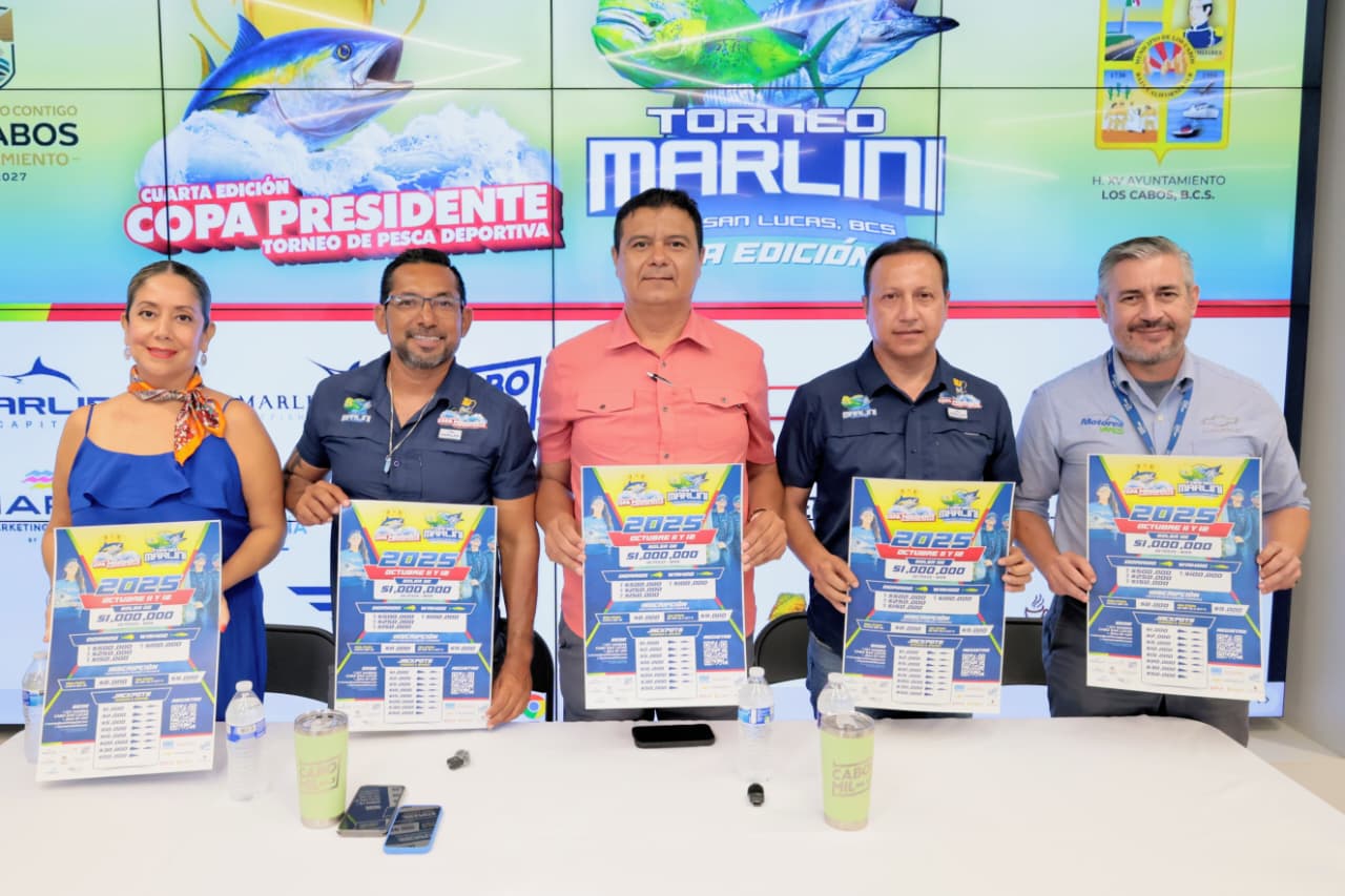 Los Cabos, Baja California Sur.– Con una bolsa garantizada de $1 millón de pesos en premios, fue anunciado en conferencia de prensa el torneo de pesca deportiva “Copa Presidente–Marlini”, que celebrará su cuarta edición los días 11 y 12 de octubre, en el marco de las Fiestas Tradicionales Cabo San Lucas 2025.