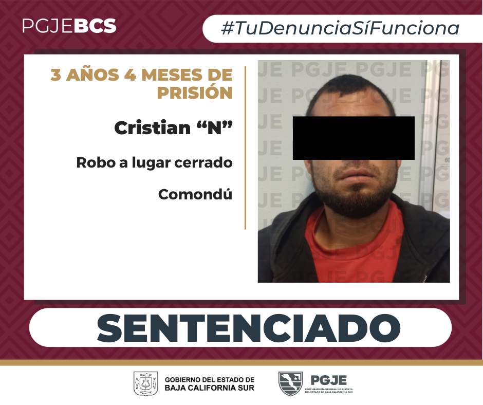 Por el robo de, equipo de cómputo, un celular, cámaras, bocinas, herramienta y una bicicleta de undomicilio que se ubica en la colonia Pioneros en Ciudad Constitución la Procuraduría General de Justicia del Estado (PGJE) de Baja California Sur, obtuvo sentencia condenatoria de 3 años y 4 meses de prisión y un día de multa en contra de y Cristian“N”.