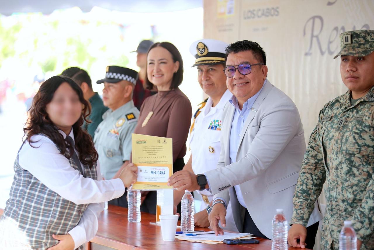 La ceremonia contó con la presencia de la titular de la Dirección Municipal de Educación, Juana Ortiz; la directora de Catastro, Judith Díaz Spíndola; el VIII regidor, Celestino Atienzo Beltrán; el director de Seguridad Pública, Christopher Jordi López Monje, así como el representante del Gobierno de Baja California Sur en el municipio, René Núñez Cosío, entre otras autoridades.