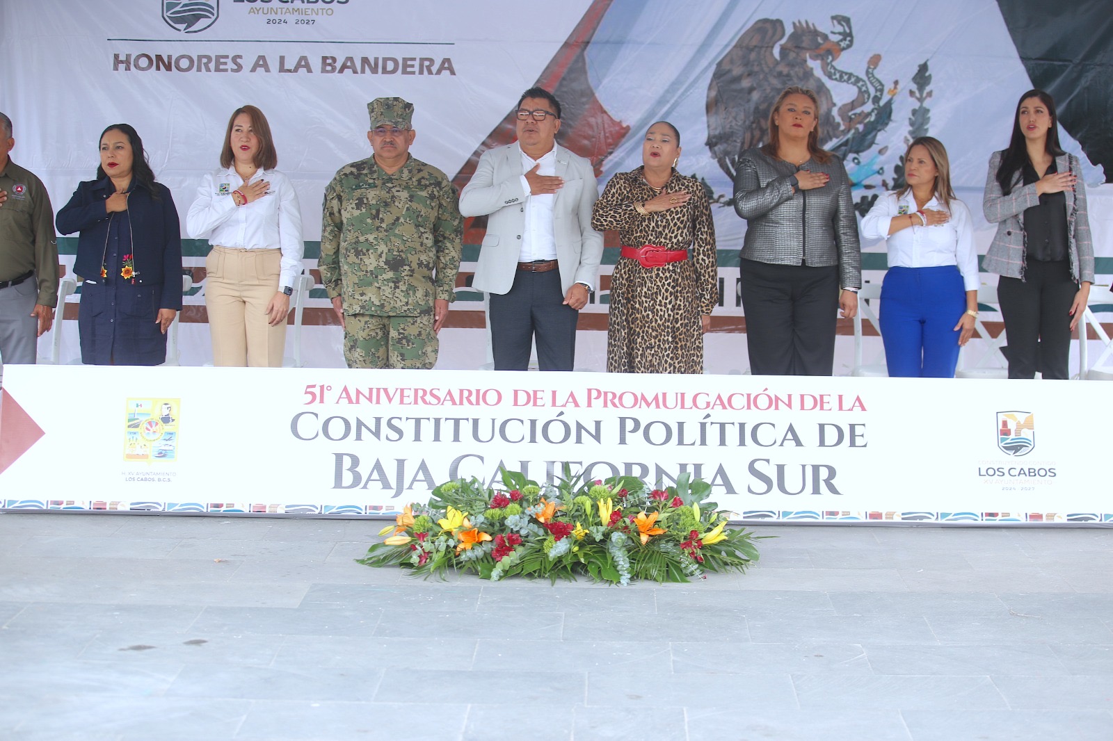 Los Cabos, Baja California Sur. – En representación del presidente municipal del XV Ayuntamiento de los Cabos Christian Agúndez Gómez, este lunes 19 de enero, el secretario general municipal, Alberto Rentería Santana, encabezó la ceremonia conmemorativa por el 51º aniversario de la Promulgación de la Constitución Política de Baja California Sur, acto celebrado en la explanada de la plaza pública Tte. José Antonio Mijares, en San José del Cabo.