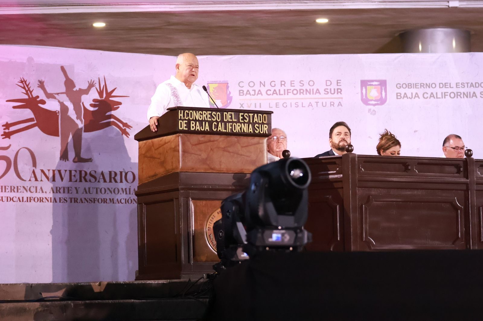 Durante la sesión pública solemne de conmemoración del 50 aniversario de conversión de territorio a estado libre y soberano de Baja California Sur, el gobernador Víctor Manuel Castro Cosío señaló que nuestra historia no se detiene aquí, “es solamente el inicio de un largo camino que nos llevará a consolidarnos como un referente nacional e internacional de progreso y desarrollo con justicia y dignidad”.
